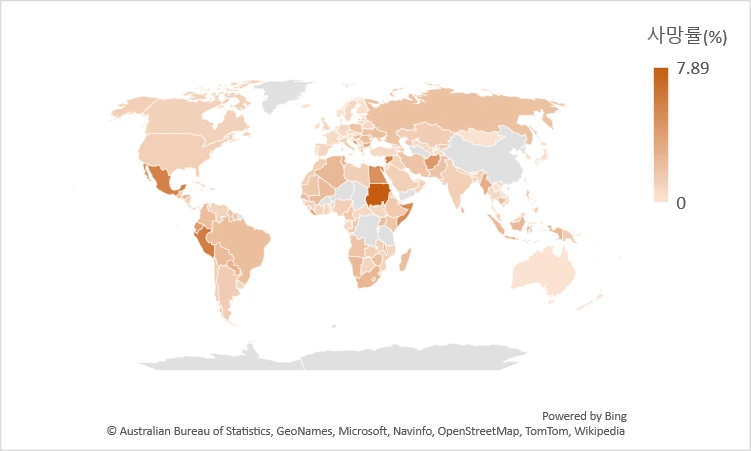 수단, 페루, 멕시코가 각각 7.9, 6.0, 5.7%의 높은 사망률을 나타낸다.