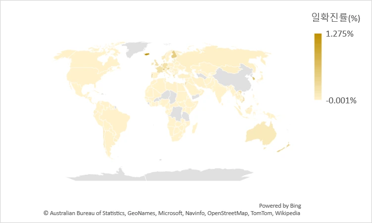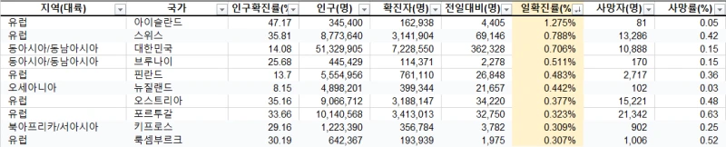일 확진자의 경우 유럽 및 아시아 지역 등 빠른 확산세를 보인다. 아이슬란드가 1.28% 수준이고, 그 뒤를 스위스 (0.79%) 와 대한민국(0.71%) 이 따르고 있다. 오미크론으로 변이된 코로나 경우, 유럽 지역이나, 동아시아 오세아니아에서 확산 속도가 빠른 것으로 보인다.