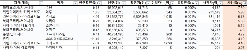 확진율이 높다고 해서, 사망률이 높지는 않다. 의료 인프라가 상대적으로 부족한 아프리카 및 라틴아메리카 지역이 높은 사망률을 보인다.