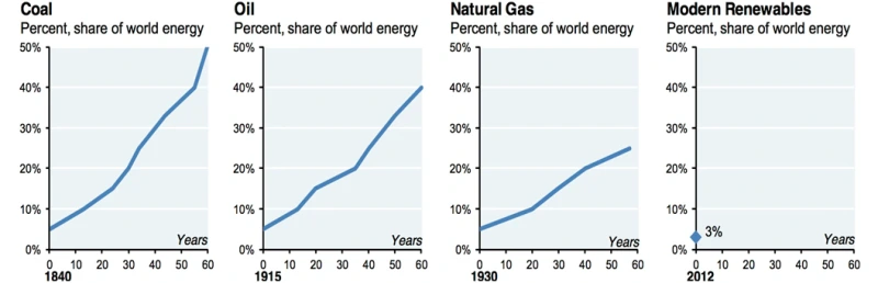 에너지 전환은 오랜 시간이 걸린다. 아래 그림은 에너지 자원이 도입된 후 얼마나 오랜 시간이 걸리는지 보여주고 있다. 석탄의 경우 1840년 이후 60년 동아 약 50% 에너지 시장을 장악했다. 오일의 경우 60년 동안 40%를 차지하고, 천연가스는 60년 간 20% 넘는 수준을 보인다. 신재생 에너지는 2012년 이제 3%를 점유하고 있다. 오랜 시간이 걸릴 것으로 예측된다.