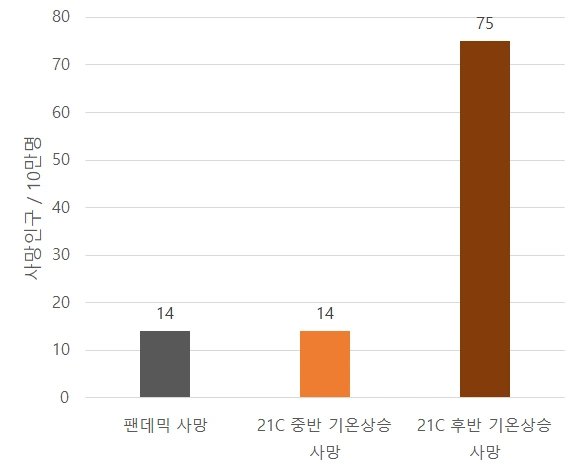 해수면 상승, 극지방 빙하 사라짐, 수온 상승, 동식물 서식지 변경 등 다양한 위험이 일어나고 있다. 저자는 이러한 내용을 2021년 현재 발생 중인 글로벌 팬데믹과 비유하여 설명하고 있다. 현 수준 탄소 배출이 유지되면, 21세기 중반 팬데믹 수준 사망 인구가 예상된다. 이러한 상황은 지속적으로 악화되고, 21세기 후반에는 팬데믹으로 인한 사망자 숫자보다 5배 늘어날 것이다. 이것이 기후 재앙으로 일어날 수 있는 영향이다. 팬데믹에서 보건뿐 아니라, 경재 상황도 급격히 무너졌다. 기후 재앙을 막지 못하면 그것보다 훨씬 큰 경제 위기 쓰나미가 나타나게 된다.