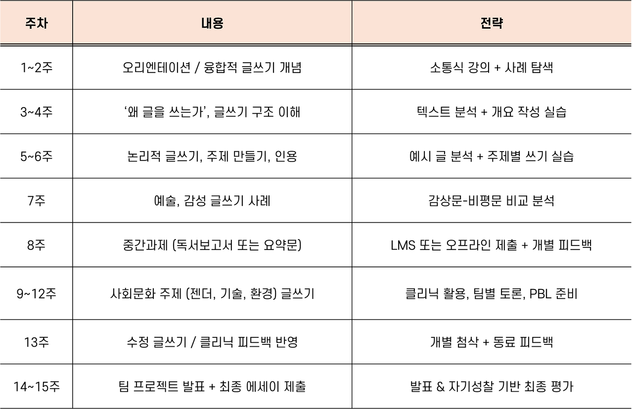 환경 : PPT, LMS, 글쓰기 클리닉 시스템 지원 활용 가능