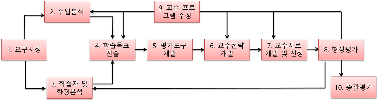 ⑨ 교수(수업) 프로그램 수정: 형성평가의 결과를 바탕으로 수업프로그램의 결점을 수정∙보완하는 단계로, 주로 수업 분석의 타당성, 학습자의 출발점 행동 및 특성 분석의 정확성, 검사 문항의 타당성 등을 검토