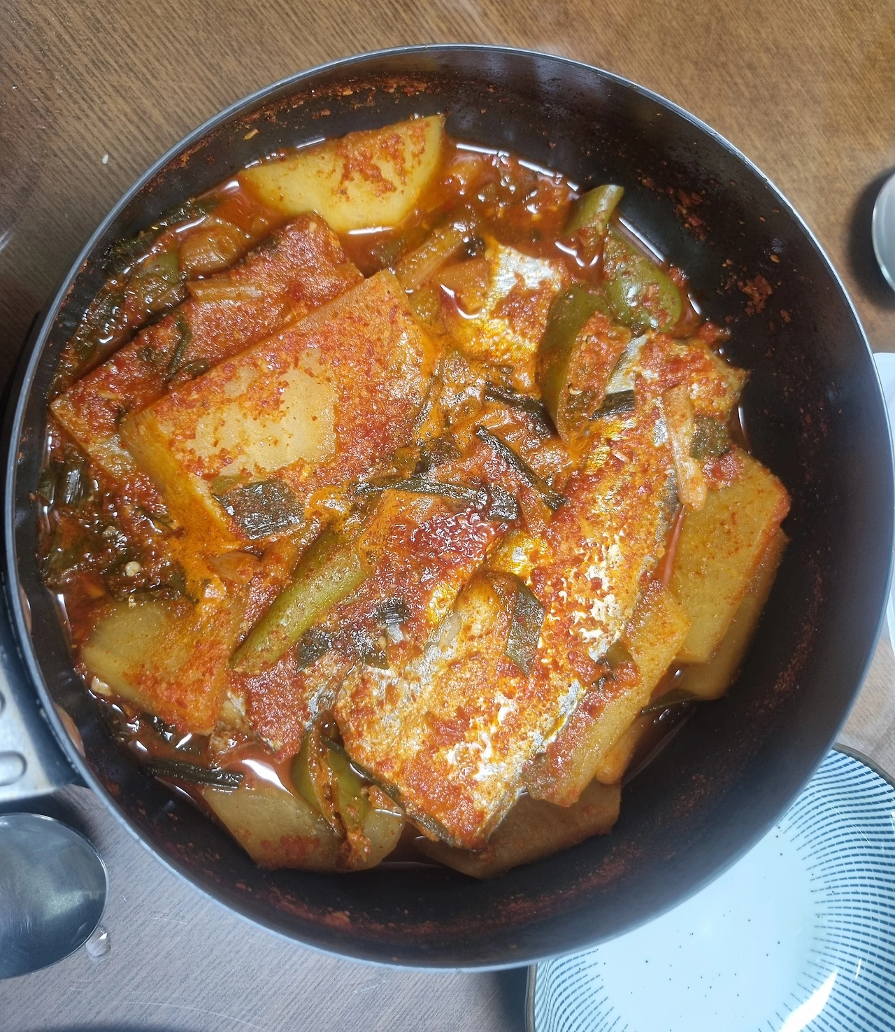 마트에서 갈치를 사서 조림을 만들었다. 식탁에 점심을 차리고 부모님을 모셔왔다.