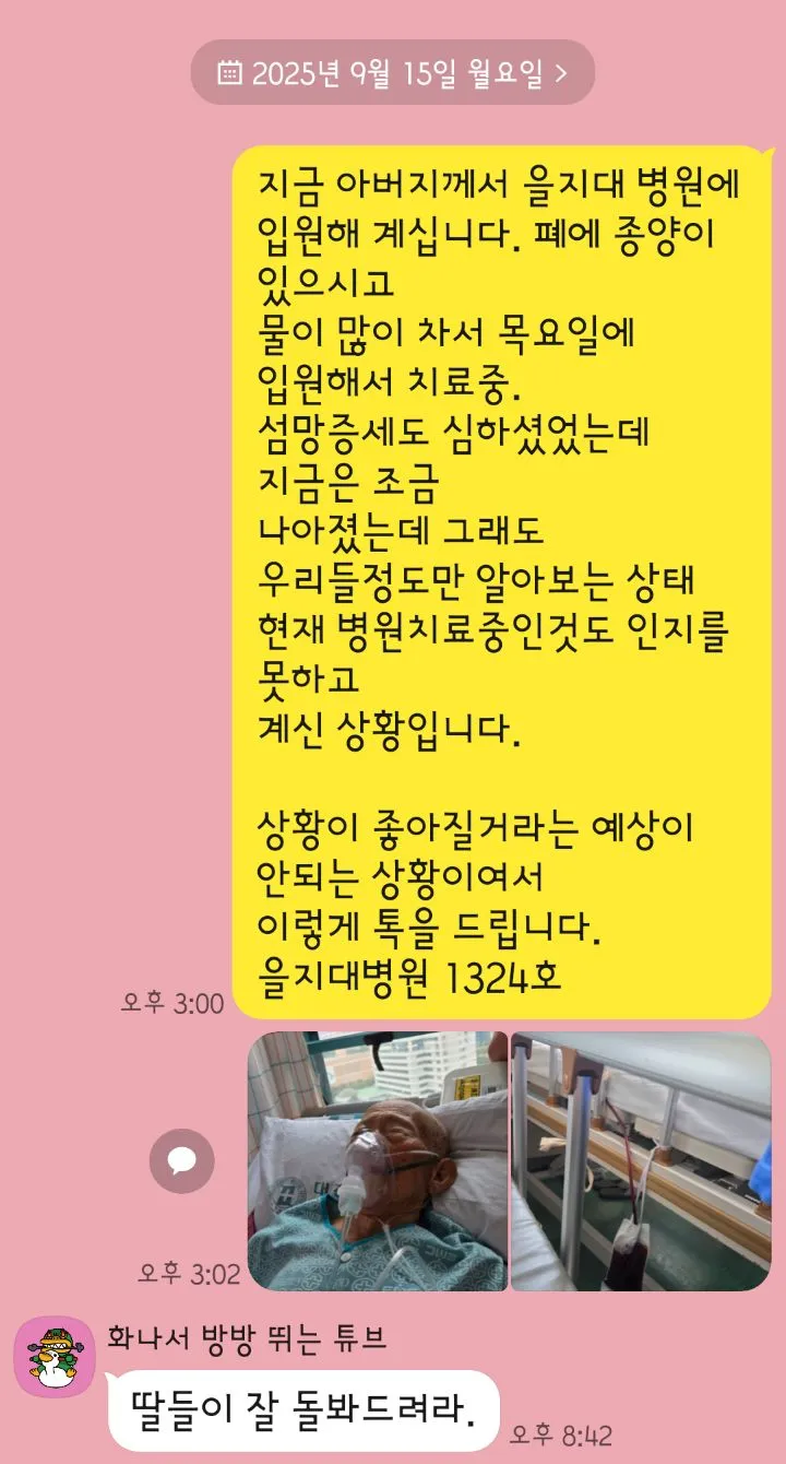 처음 아버지가 병원에 입원하시고 언니들과 오빠들에게 알리는 문제에 대해 상의를 하였다. 작은 오빠와 상가 임대관련해서만 톡을 주고받았고 일체 부모님 관련해서는 따로 소식을 전한 바는 없었는데, 그래도 위중하시면 연락을 드리는 게 도리인 것 같다는 언니들의 의견에 시술 후 대표로 내가 개인톡으로 소식을 전했다