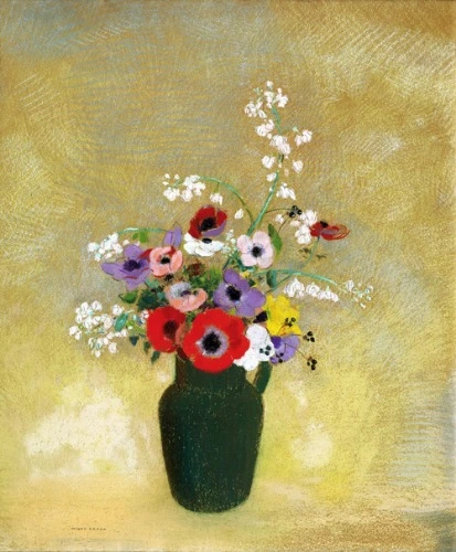 오딜롱 르동에 대해 알아보니 모네와 동시대에 태어나 말라르메와 마티스의 칭송을 받고 고독한 삶을 살았던 상징주의 화가입니다. 초기에는 단색의 어둡고 몽환적인 판화를 취급하였지만 후기에는 색을 사용해서 밝아지고 꽃과 소녀의 상징을 많이 그렸습니다. 신비하면서도 강렬한 색채의 꽃그림도 후대 사람들의 사랑을 받게 됩니다.