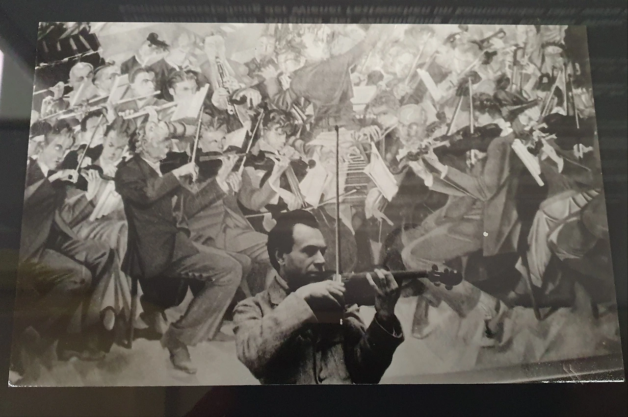 아래쪽 흑백사진: 자신의 그림 <오케스트라> 앞에서 바이올린을 켜고 있는 맥스 오펜 하이머