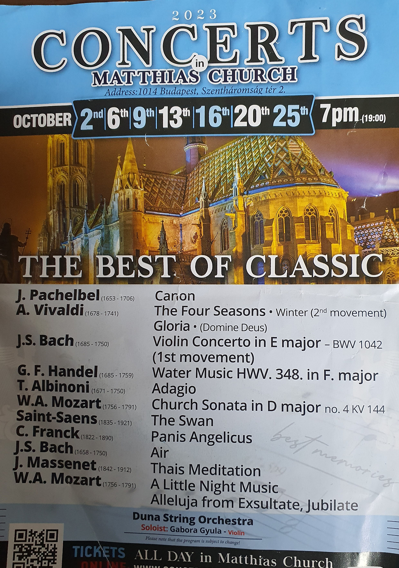 연주회 관람자만 출입하는 저녁시간의 성당은 조용하고 차분했다. 예배당 내부의 장식들도 더욱 경건하게 빛나는 듯하며…. <캐논>을 시작으로 일곱 명의 앙상블이 현을 켰는데, 얼마나 크고 풍성하게 울리던지! 마치 20명 정도의 현악 오케스트라가 연주하는 것 같았다. 부드러운 선율이 자녀들이 어렸을 적 이곡을 연주할 때의 옛 시간으로 데려가, 한동안 둥지가 북적일 때의 추억에 젖었다. 레퍼토리가 모두 쉬운 클래식곡 이어서 마음 편히 즐길 수 있었다. 여기서 내 생애 최고로 아름다운 < 타이스의 명상곡>을 들었다.