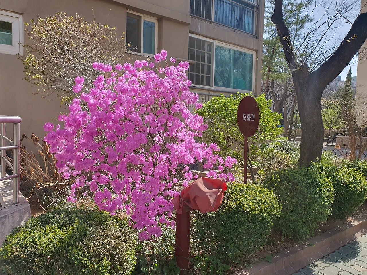 엊그제 저쪽 동 아파트 뒤뜰에서 뜻밖에 진달래를 만났다.