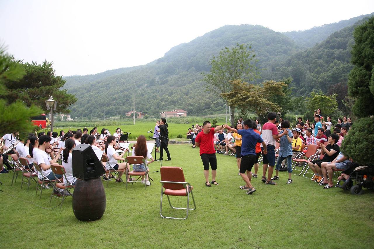 공주 소망공동체에는 논둑과 작은 산들로 빙 둘린 정원이 있다. 너무 더울 때를 빼고는 야외 음악회를 열었는데 울림이 없어 소리는 약했지만 운치가 있었다. 하늘에는 커다란 구름이 두둥실, 석양 무렵 산골 마을의 밥 짓는 연기 사이로 오케스트라 선율이 퍼져 나갔다. 색소폰 솔로가 <Love me tender>의 구수한 곡조를 선보이면 관객들이 흡족해서 “와우, 멋진데!” “섹시한데!” 하며 추임새를 넣었다.
