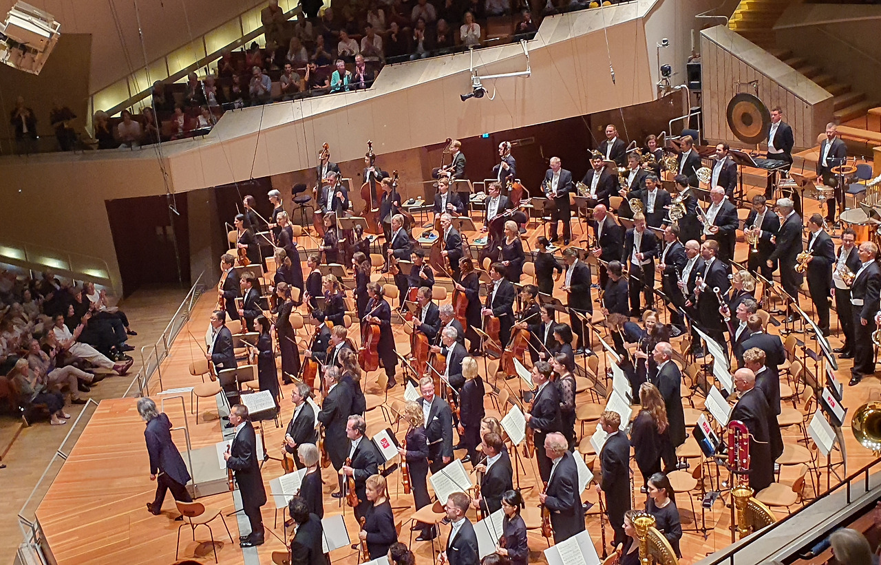 콘서트 홀은 명성에 걸맞게 무대 앞뒤로도 객석을 배치하며 시원하고 널찍했다. 무대 가까운 3층 옆 좌석이라 모든 악기 모습이 환히 내려다 보였다. 마음을 잡으려고 숫자를 셌는데 호른 9명, 바순 5명, 첼로, 칸트라베이스는 각각 8명 등. 우리 쪽 바로 아래에 있는 하프 두대와 딸랑거리는 타악기는 얼굴을 볼 수 없다.