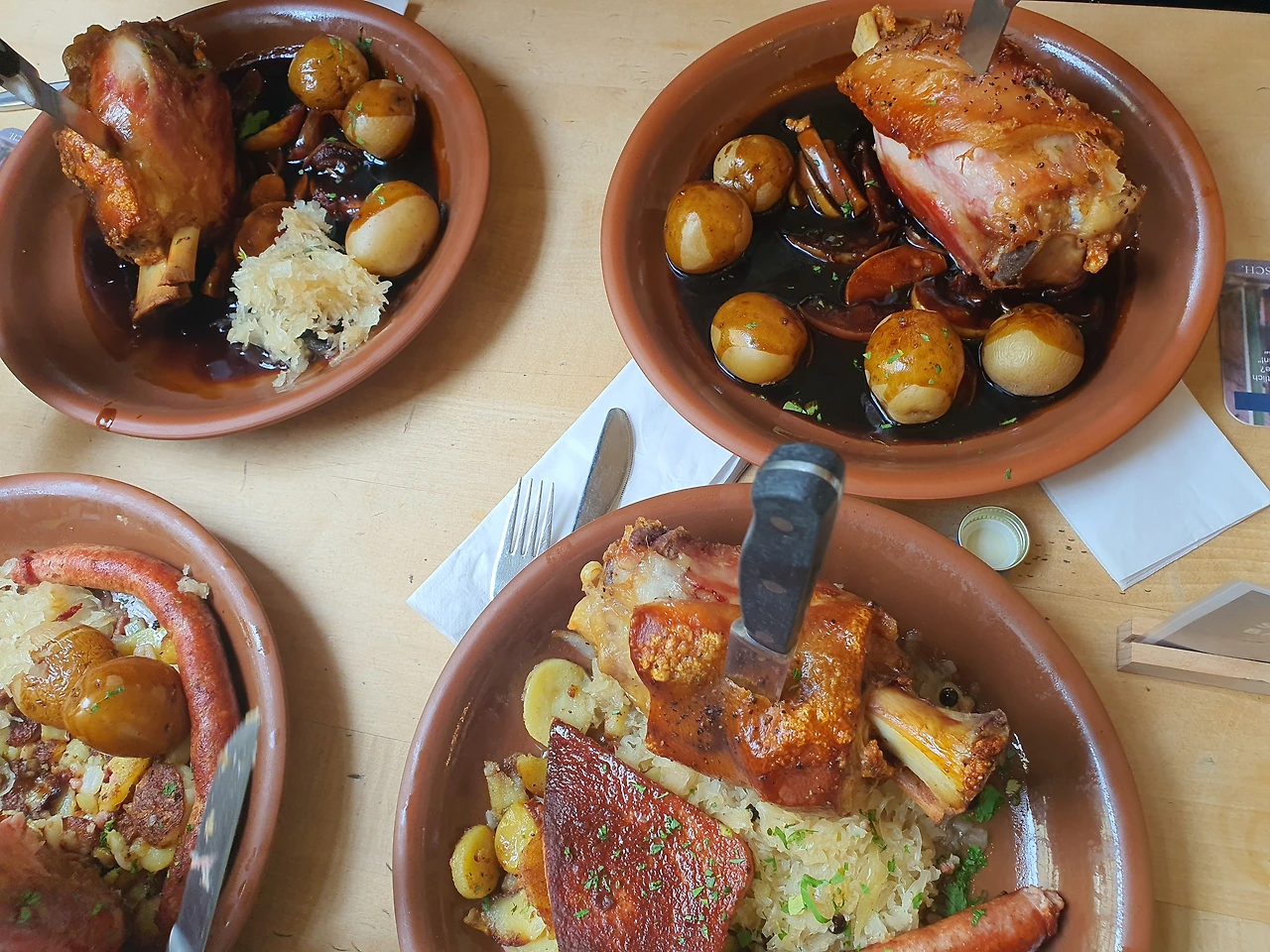 슈바인스학세(학센)는 대표적인 독일 음식이다. 돼지 관절 부위를 향신료에 절이거나 살짝 삶아서 (맥주에 삶는다고도 함) 껍질이 바삭할 때까지 구워낸다. 한국식 족발과 비슷하지만 발끝 부위는 사용하지 않고 정강이와 무릎 부위다. 사진은 여행 마지막 날 프랑크푸르트 Struwwelpeter 라는 음식점의 학센이다. 여자 네 명이 함께 먹었는데도 이 접시를 다 치우지 못했다.