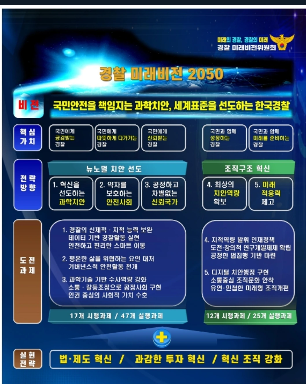 △4차 산업혁명에 수반하는 새로운 위협의 등장 △사회·경제의 대전환 △자치경찰제 도입 등 미래 치안 환경 변화에 대응해 ‘미래·혁신·신뢰’ 등의 핵심가치를 포함한 <경찰 미래비전 2050>도 발표하였다.