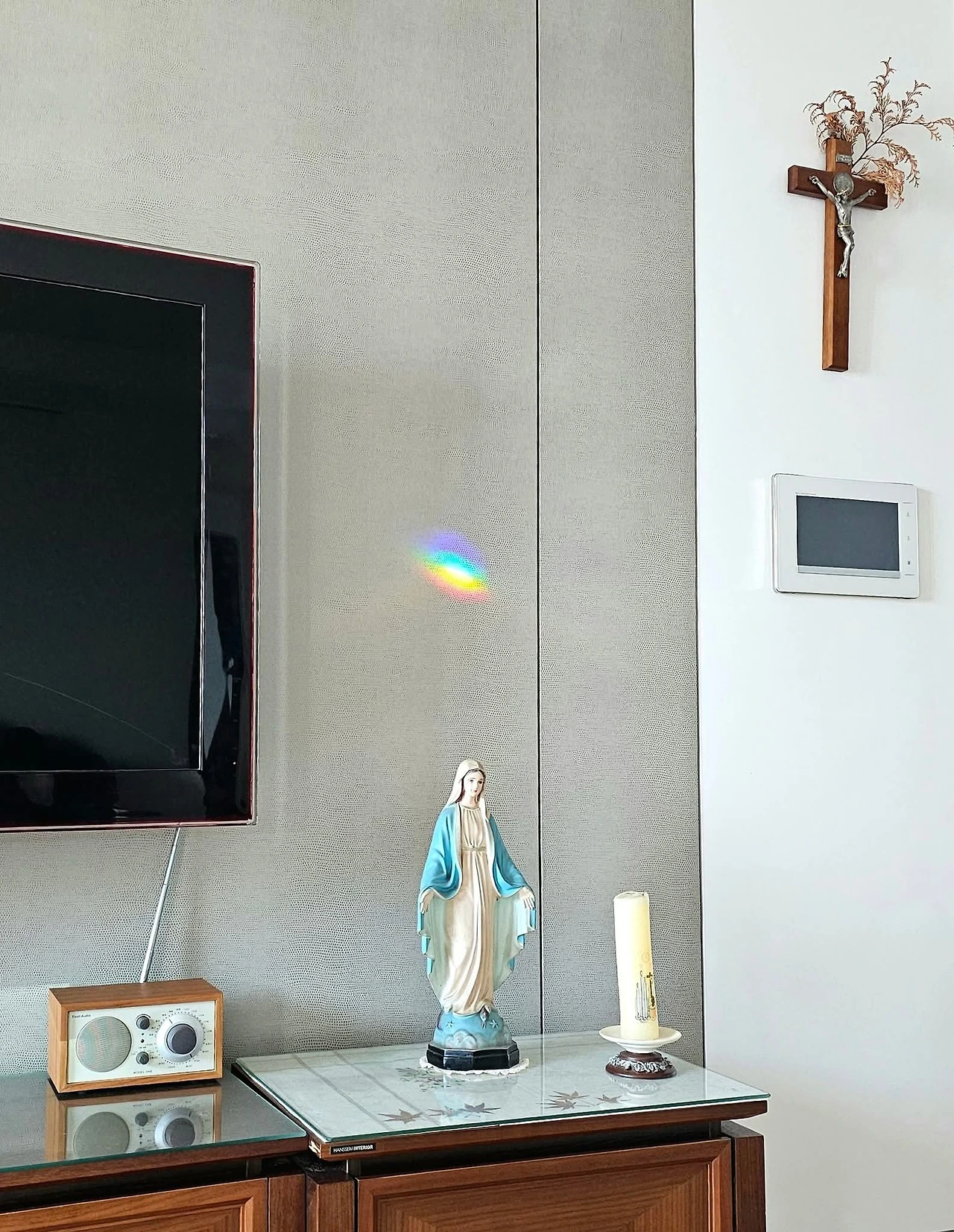 남자는 거실로 나가고는 숨을 멈추었다. 거실장 위에 올려둔 성모상 위로 무지갯빛 아우라가 드리워지고 있었다. 햇살이 마치 성모를 감싸듯 빛났다.