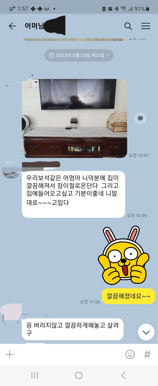 '우리 보석 같은 어멈아, 니 덕분에 집이 깔끔해져서 잠이 절로 온단다. 그리고 집에 들어오고 싶고 기분이 좋네... 네 말대로, 고맙다.'라고 말이다. 나중에 안 사실이지만 거실장은 그냥 버리지 않고 그 위에 물건을 싹 정리하고 예쁜 천을 덮어 새로운 느낌의 공간으로 꾸미셨다고 한다.