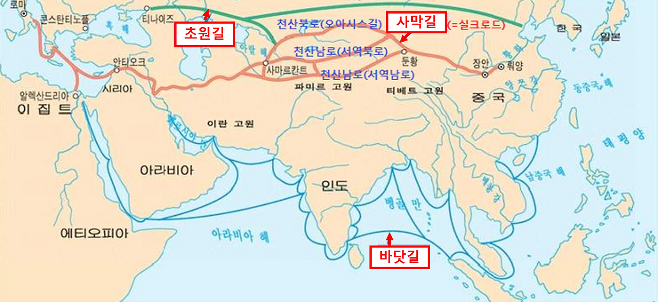 실크로드 3대간선 5대지선의 개념도([지도 출처] http://krnoh.blog.me/100053559449)