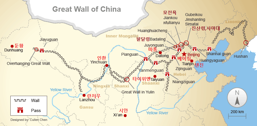 만리장성을 한 줄로 늘어 세우면 지구 반지름 6,400km보다 더 길고 지구 둘레의 1/6을 넘는다. 그래도 실감이 나지 않는다. 직접 가봐야 장대한 스케일의 일부라도 몸으로 느껴지지 않을까?