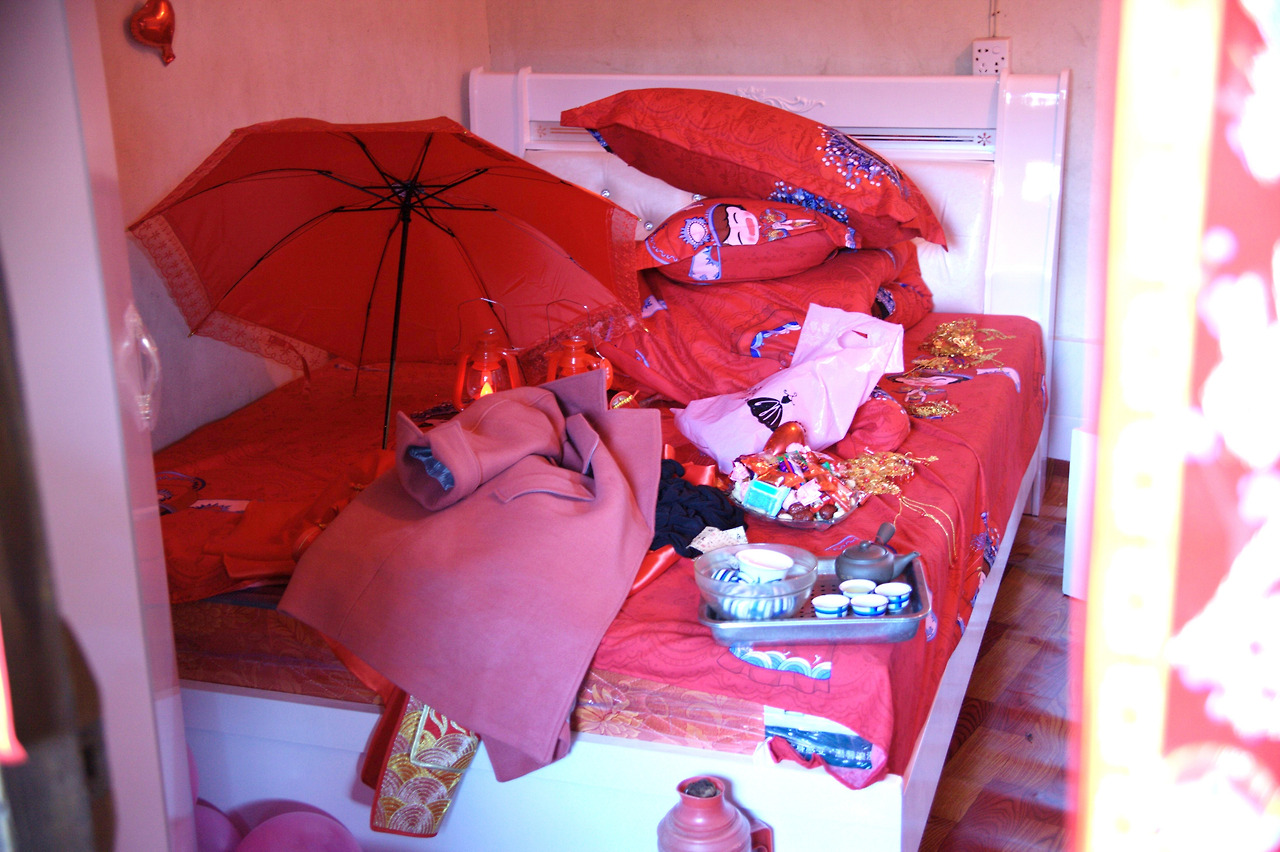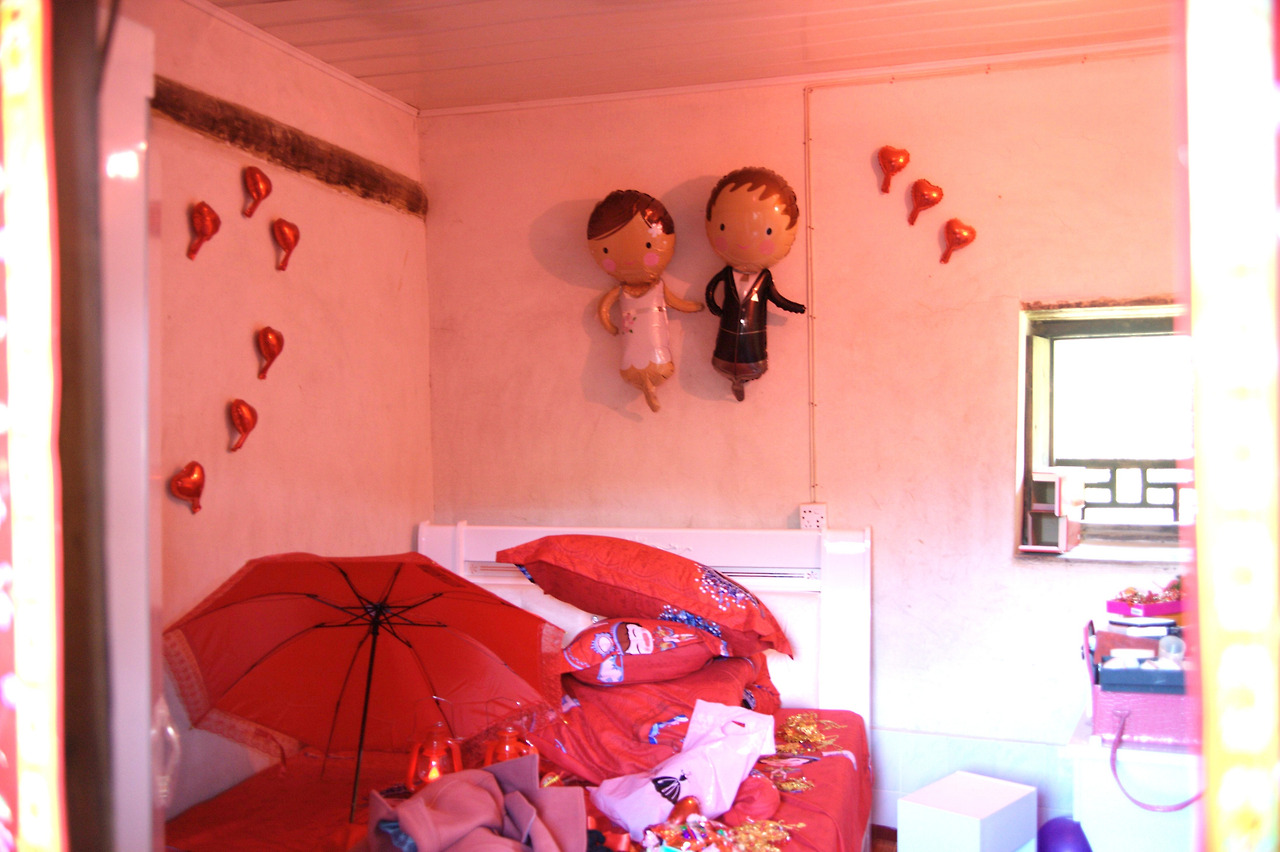 붉은 색으로 장식물로 꾸며놓은 신랑신부의 신방