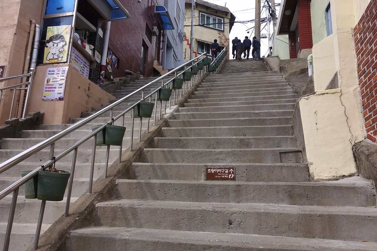 부산에 와보니 부산은 도시 태생적으로 산과 바다가 뒤엉켜 만들어진데다가 평지 부족한 도심 산자락은 물론 바다 가까운 산자락엔 집만 있는 게 아니었다. 시장과 상점, 학교, 목욕탕, 도서관까지 산비탈에 빼곡히 들어앉았다. 당연히 이들로의 접근을 위해서 산 허리를 감아도는 도로가 있고 등고선과 나란하게 층층이 구비구비 만들어진 산복도로에 비탈진 골목길과 미로 같은 계단길이 모세혈관같이 연결되어 있다.