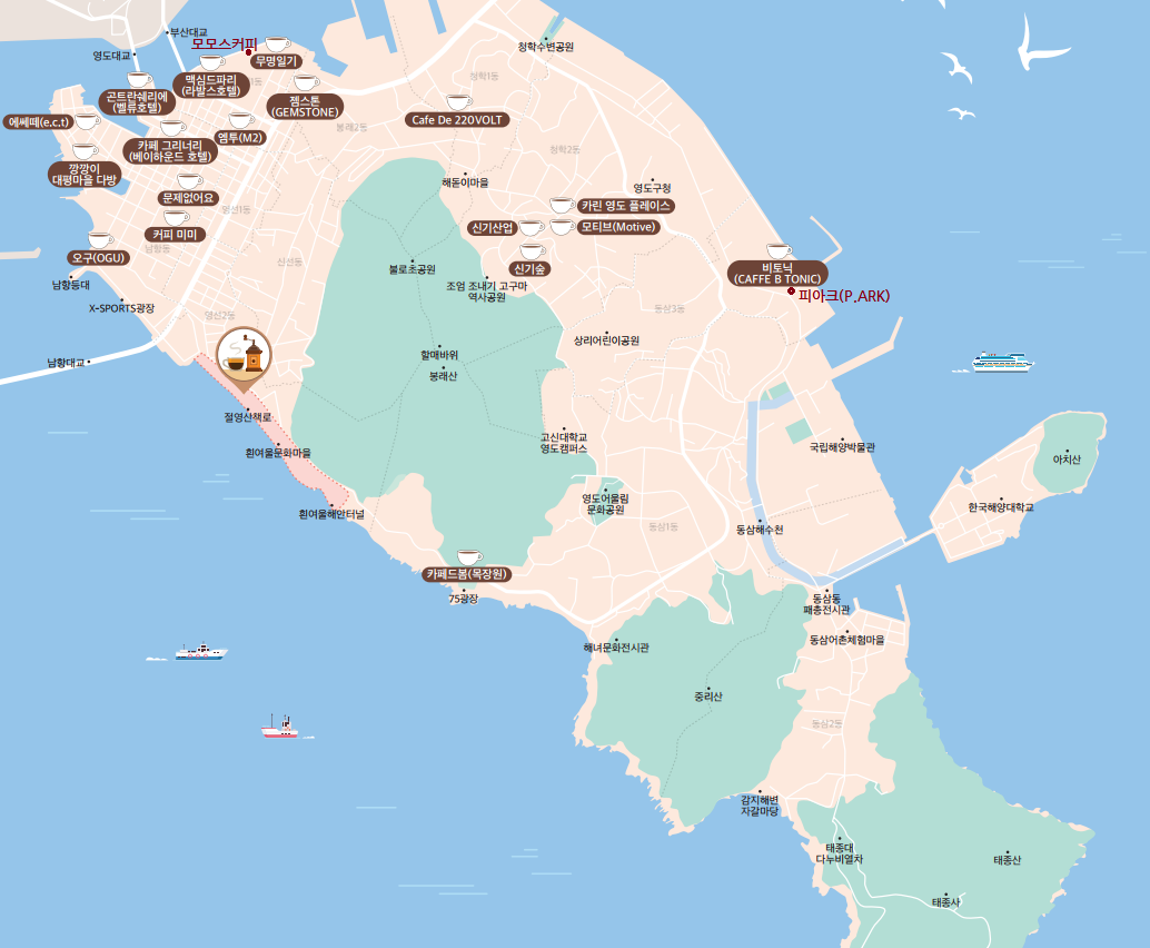 영도는 이제 '바다에 갔다가 커피 한잔'이 아니라 커피를 마시러 찾아야 할 섬이 되었다. 2016년 신기산업 이후 속속들이 들어서는 감성 카페로 인해 2019년부터 영도에서는 커피 축제가 열리고 있다고 한다. 탁 트인 영도 바다만 카페로 들어가는 게 아니라 영도 항만, 폐선박창고와 폐공장, 폐수영장과 폐목욕탕 등 영도 사람들의 삶의 흔적까지 카페로 재구성되어 들어가고 있다. 영도 카페에서 커피와 함께 영도의 지역성도 함께 음미해보자. "출발, 걸어서 카페 속으로~"