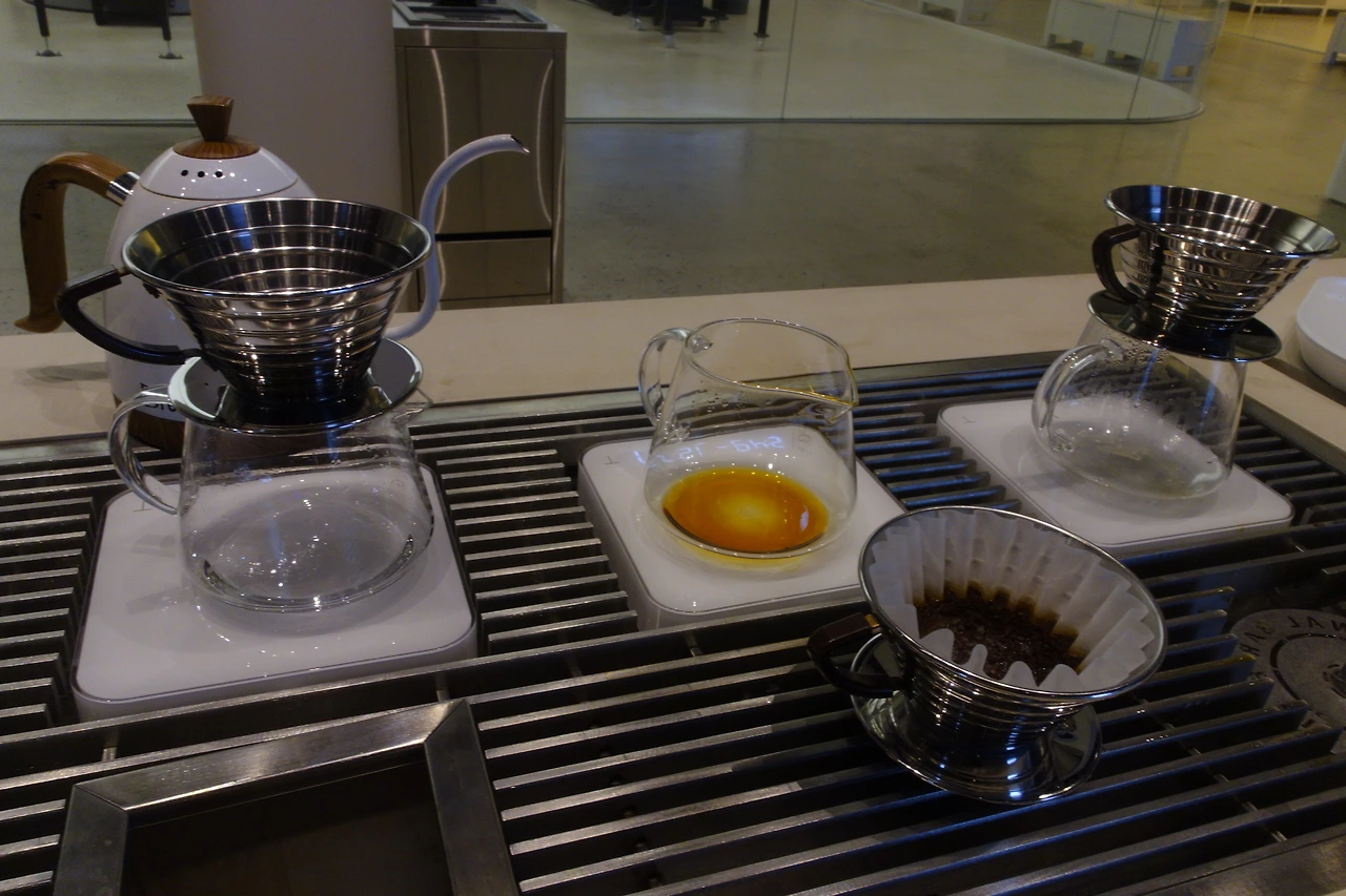 카페라기보다는 커피 견학장이고 커피 체험장이다. 직설적으로 말하면 '커피 시음장'이다. 마트의 시식 코너 같은 곳이다. 단지 '한 모금의 공짜 커피'가 아니라 내 돈 내고 '한 잔 잔째로 시음'한다는 게 차이점이다. 당연히 느긋하게 커피 마실 수 있는 등받이 의자는 없다. 지갑 털리지 않게 조심할 것! 나도 모르게 이것저것 포장 커피를 지르게 된다. 커피 한 잔 마시러 갔다가 몇만 원 긁고 나오는 곳.