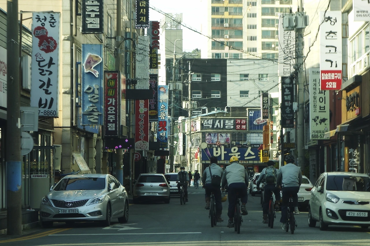 해질 무렵 옥포 시내에서 흔히 만나는 풍경 - 대우조선산단에서 옥포 시내로 자전거 퇴근하는 사람들