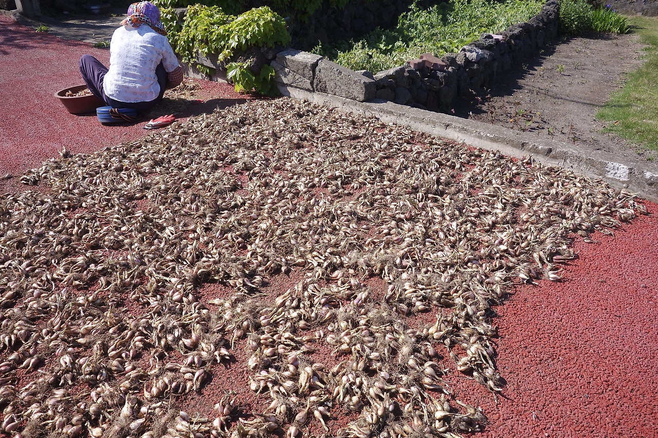 올레길 가는 버스를 타러 나가다가 이웃 집 도로변에서 마늘을 말리고 계시는 동네분을 만났다.