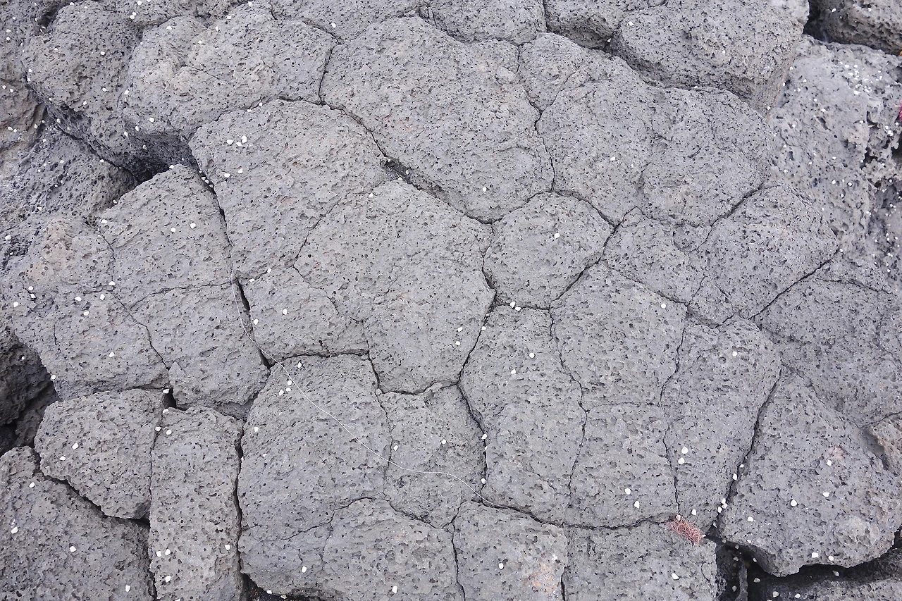용암 위를 걸어 다니다가 육각기둥의 주상절리도 찾았다. 중문의 지삿개주상절리 보다 정교하지도 않고 키도 작지만 내 눈으로 발견하니 반가움에 더 신기하다. 그러고 보니 내 발 밑은 다각형들의 향연이다. 육각형과 그 의 형(칠각형) 아우(오각형)가 한자리에 모였다. 유동성 큰 용암지대의 특성인 밧줄 구조(새끼줄 구조)도 흔하다. 꼬인 새끼줄 모양으로 주름져 굳은 것으로서 용암이 흘렀던 방향과 수직으로 동심원상으로 퍼져나간 구조이다.