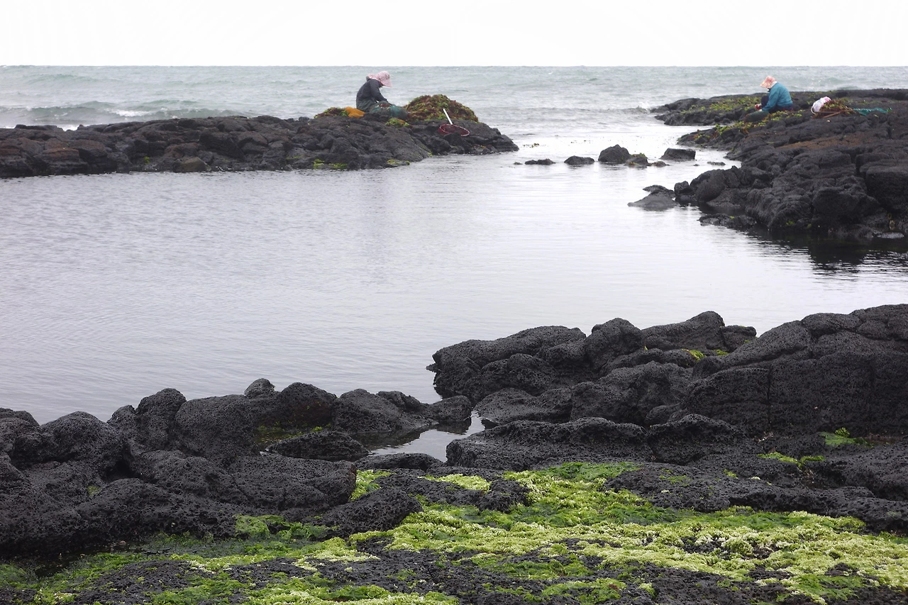 밀물과 썰물의 차가 큰 조간대. 용암대지의 끝자락에서 우뭇가사리를 채취하고 있는 사람들.