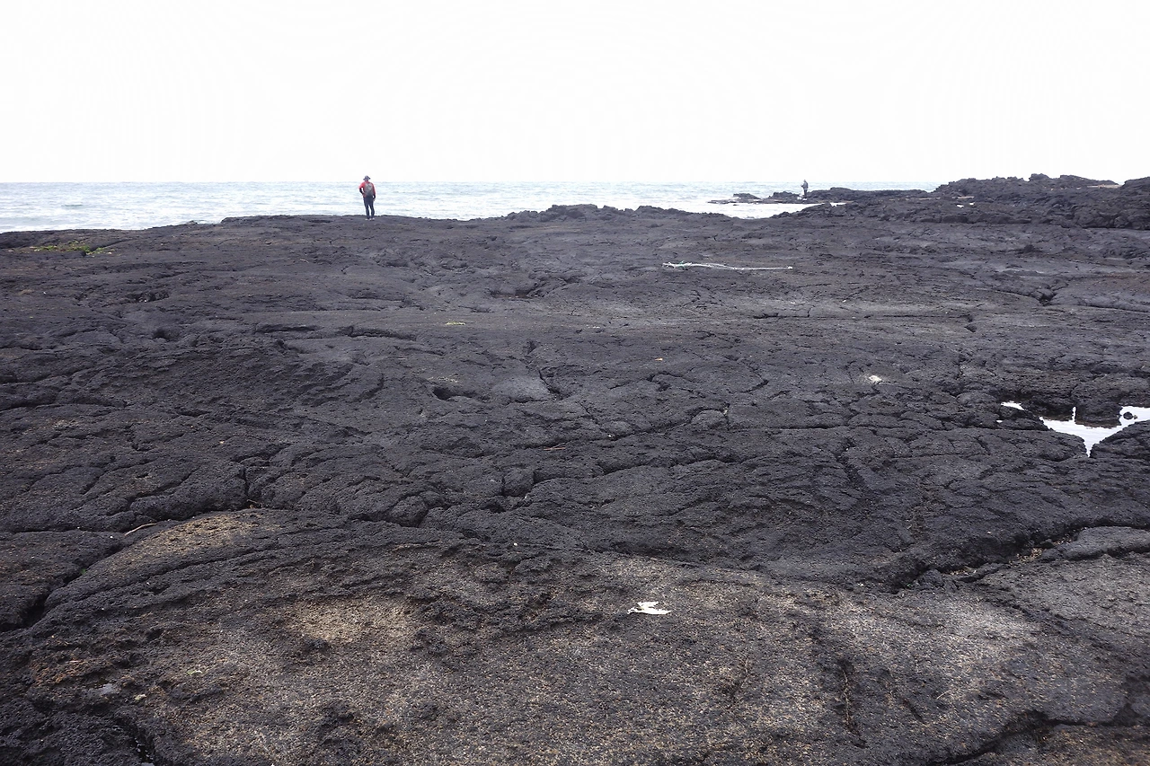 현무암 흐드러진 김녕해변은 넓은 흰모래사장과 흑백 대비가 선명하다. 점성이 작아 잘 흐르는 성질을 가진 용암이 만든 평탄한 용암대지가 해변 곳곳에 널브러져 있다. 김녕해변이 만장굴이나 다른 용암굴과 가까운 것과 무관하지 않으리라. 그런 용암동굴을 빠져나온 엄청난 양의 용암이 이곳까지 흘러내려 굳었을 것이다. 이렇게 용암대지를 만드는 점성이 작은 용암을 파호이호이 용암이라고 한다. 김녕해변은 접근성이 나쁜 다른 해변 용암과 달리 용암대지 위를 맘껏 안전하게 걸어 다닐 수 있다. 일명 '용암산책'이 가능한 곳이다.