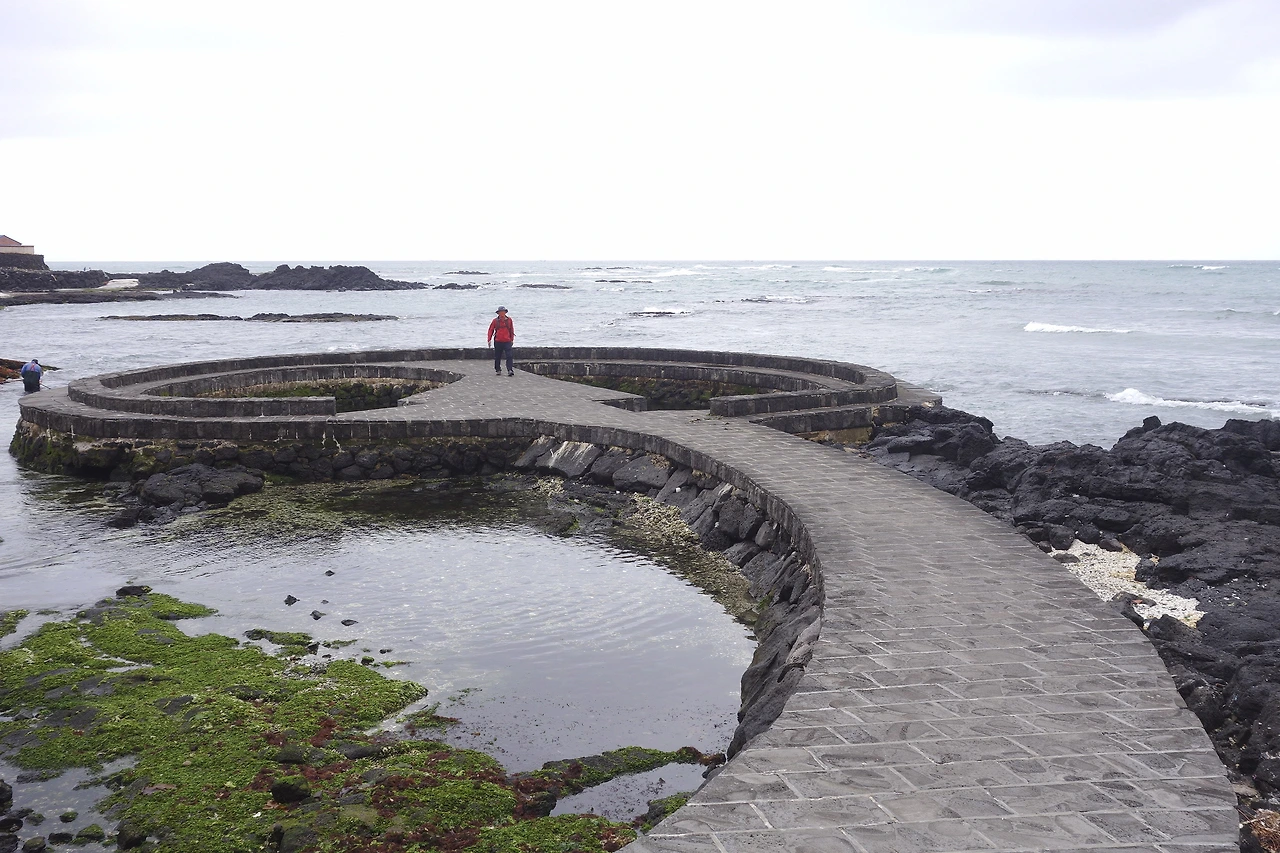김녕해수욕장을 비껴 돌자마자 바닷가에 돌담을 막아 밀물 때 들어온 물고기를 가두어 잡았다는 원담이 보였다. 또 생선 기름으로 불을 밝혀 포구를 알리던 옛날 등대인 도대불이 옛 포구의 자존심을 말하고 있었다. 마을에 인접한 용암대지인 조간대는 썰물 때면 해초나 어패류를 채취하는 작업장이 되기도 하는데, 마침 내가 갈 때마다 조간대 끝자락에서 천초(우뭇가사리)를 걷어 올리는 동네분을 만날 수 있었다.