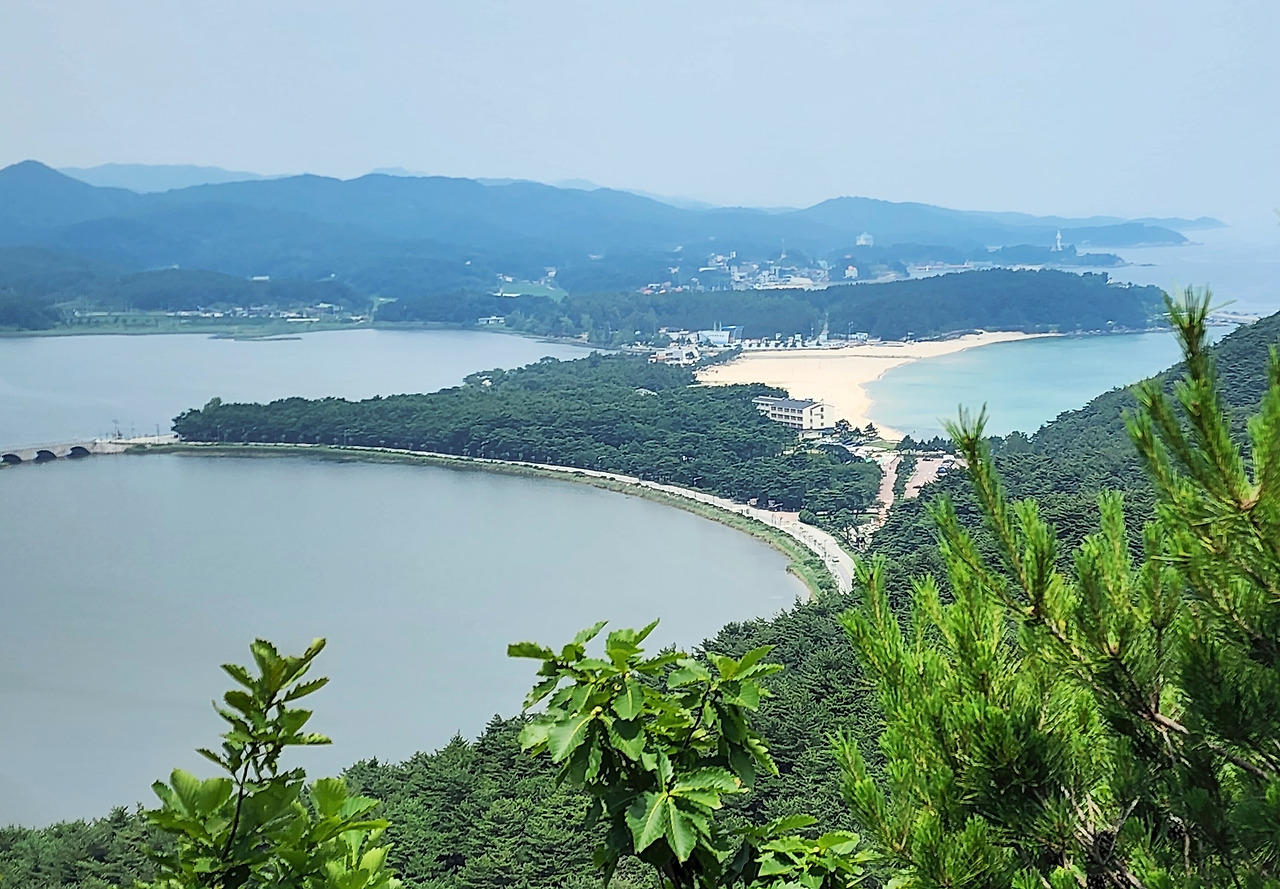 호수와 바다가 한 컷에. 응봉에서 내려다본 화진포호와 화진포해변