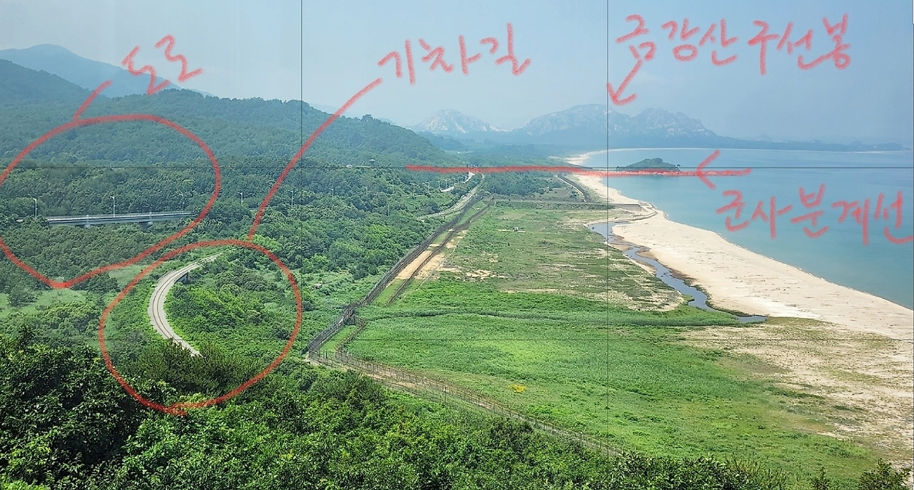 금강산으로 난 육로 도로와 북한과 연결된 철길이 뚜렷하게 보였다. 사람이 다니지 않는 길은 사연 있는 길이고 그래서 슬픈 길이다. 저 길을 따라 해파랑길은 계속 이어져야 하리니. 여기에서 다시 발걸음을 떼 해파랑길 51코스를 걸어가는 그날을 상상해본다.
