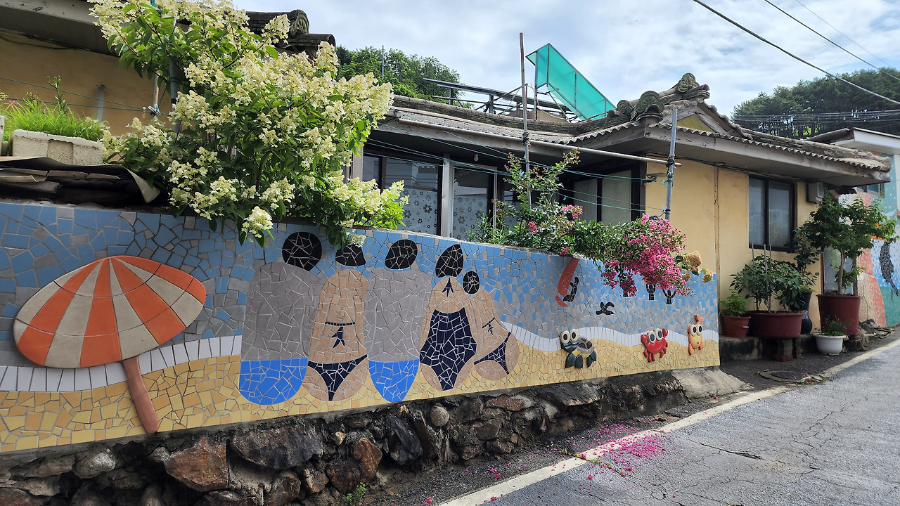 해파랑길 49코스는 초입에서 거진항 마을을 보고 지나가게 되어 있다. 한 때 우리나라 최대 명태항으로 이름을 날렸던 거진항이라더니 항구 규모가 예사롭지 않다. 수온이 높아져 이제 더 이상 명태가 찾아오지 않는 항구에 드나드는 배도 사람 수도 옛 명성에 못 미칠 뿐이다. 관광항으로 거듭나려는 듯 마을 안 길은 타일 벽화길로 꾸며놓았다. 해안의 백섬에 조성한 해상전망대도 지나가는 차들을 연거푸 멈춰 서게 만든다.