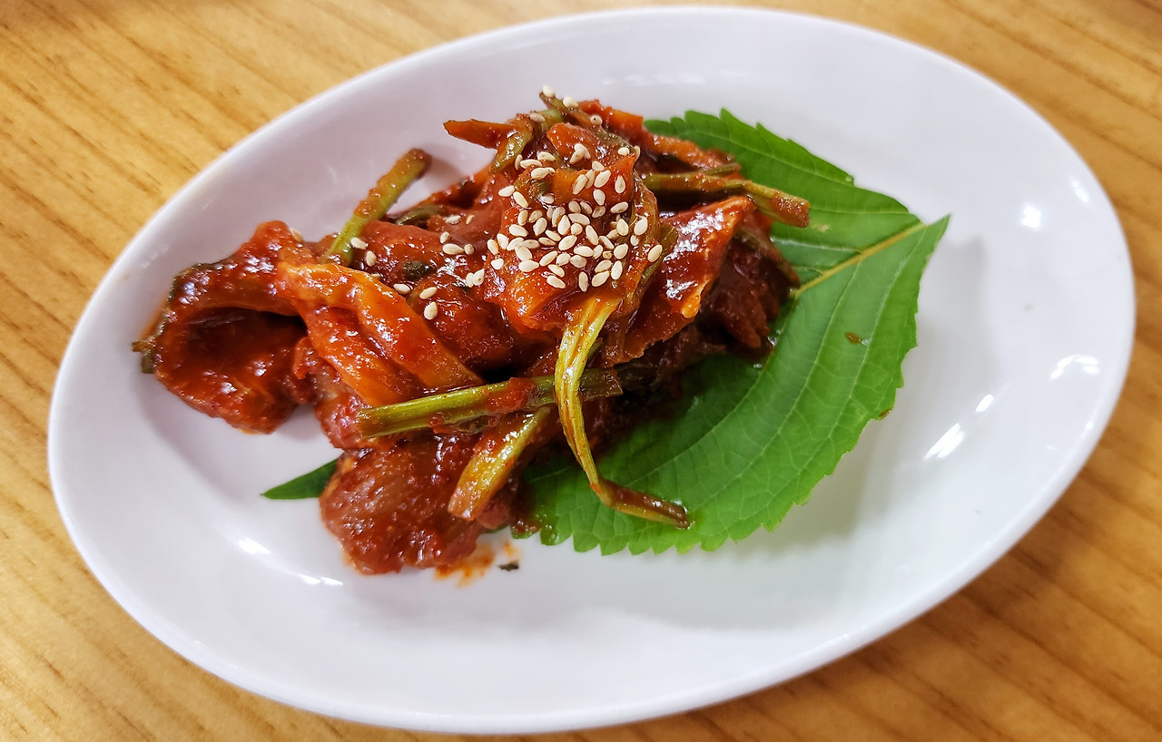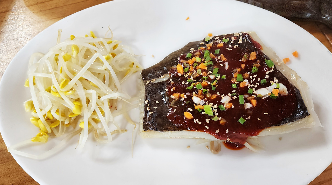 홍어애는 생 홍어간을 소금에 찍어먹는 것이고, 홍어애를 추어탕처럼 끓인 게 홍어애국이다. 아구내장과 맛도 모양도 비슷했다. 물컹거리는 비호감의 식감을 조금 견디니 살짝 구수한 맛이 올라왔다. 무침회는 생홍어를 매콤하게 무쳐낸 것이고 홍어살과 연골의 쫄깃하면서도 오드득거리는 씹히는 맛이 일품이다.