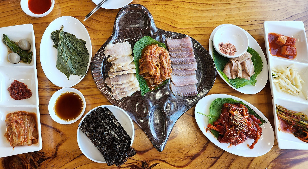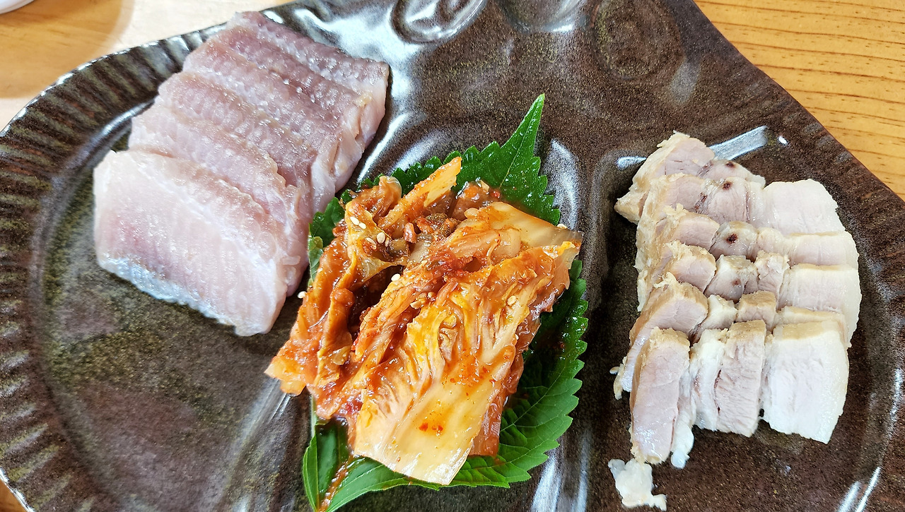 이런 영산포에 왔으니 홍어를 먹어야지. 홍어 거리에는 홍어 판매와 식당을 겸하는 곳들이 많았다. 홍어 맛을 전혀 모르는 외지인이라 여러 가지 홍어 요리를 한 번에 낸다는 호기심에 홍어 정식을 시켰다. 생전 처음 보는 홍어 요리가 하나 둘 테이블에 올려지기 시작했다. 나온 순서대로 홍어 요리를 열거하면 다음과 같다.