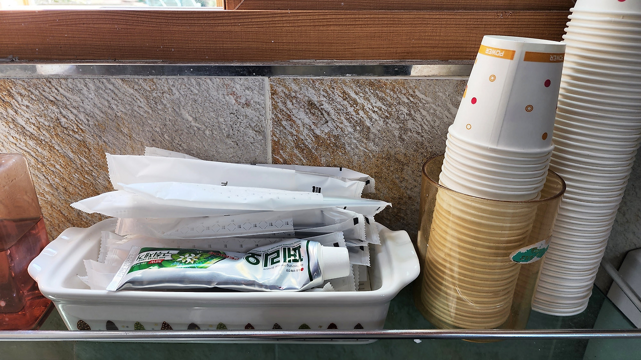 식사 후 양치질하세요~ 일회용칫솔을 비치한 홍어 식당의 화장실