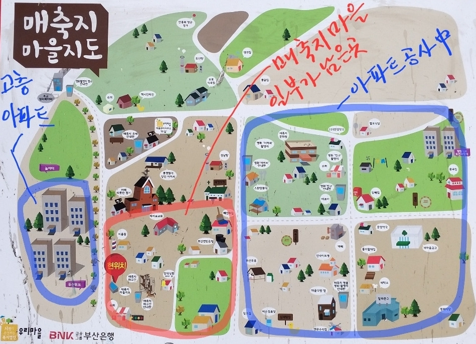 절박했던 시절 궁여지책으로 마련한 임시 수용소 막사가 오늘날까지 누군가의 집으로 남아있다는 사실이 놀라웠다. 그러나 매축지마을은 언제 헐릴지 모른다. 예전부터 도심 속 가장 가난한 이들의 주거지로서 섬이나 다름없던 매축지마을은 이미 고층아파트에 포위당했다. 과거 이 마을이었던 곳의 일부가 초고층 아파트로 변했고 지금도 아파트 공사 중이다.