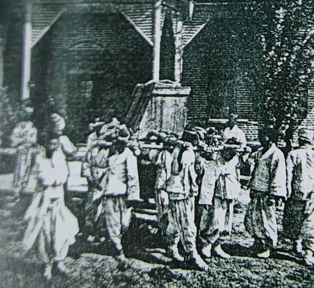 피아노를 옮기는 데 사용된 상여(왼) & 사문진에서 대구 종로까지 피아노를 옮기는 모습(오) (사진 출처 : 부산근대역사관, 부산세관박물관, 참고-부산항 이야기(이용득))