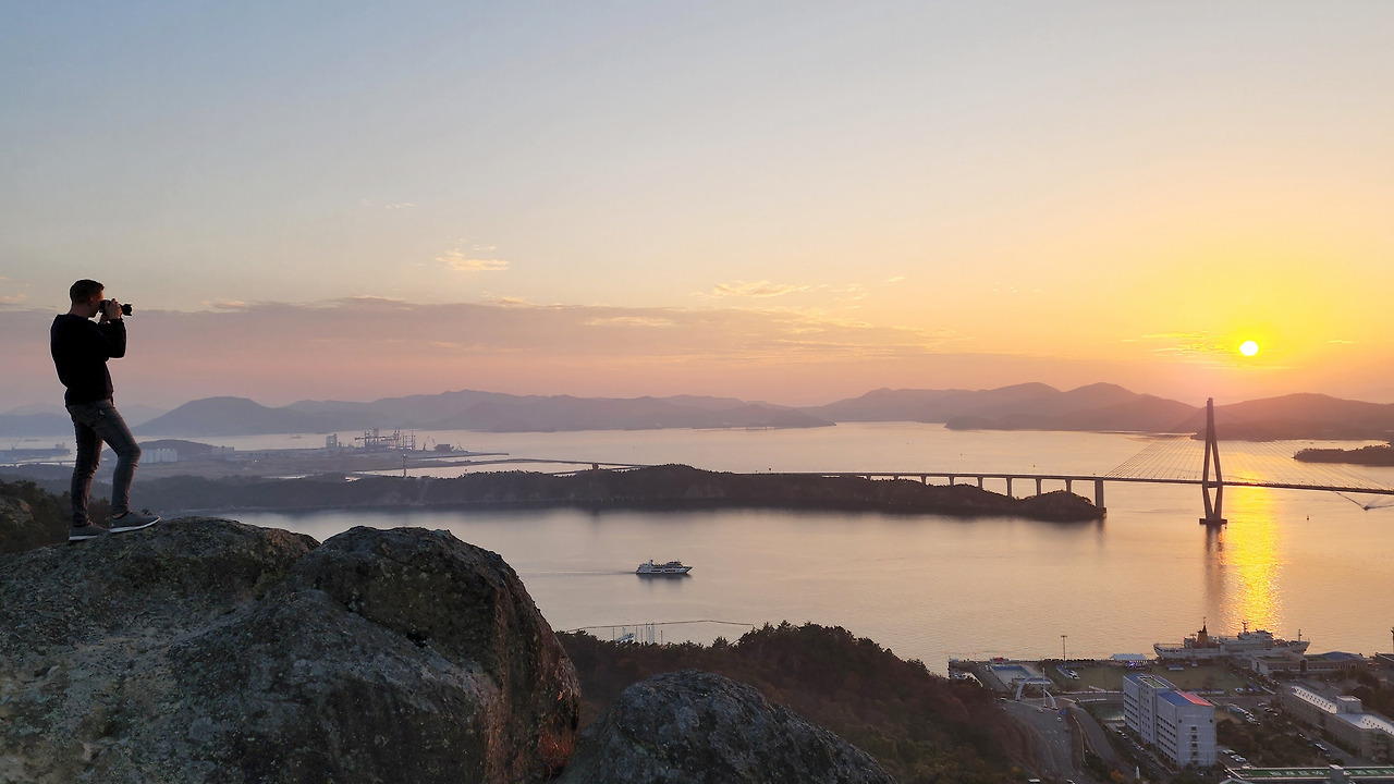 게다가 유달산의 막내봉 노적봉은 '고작 65m 고도의 노적봉'이 아니다. 평지에서 걸어올라 숨도 채 가빠지기 전에 만나는, 해발고도 65미터에서 보는 경치는 실로 과분했다. 내 맘대로 노적봉 3경을 붙여 봤다. 북쪽으로 보여주는 빼곡한 목포 시내 조망이 그 첫 번째요, 남쪽으로 몸을 돌렸을 때 한 시선 아래로 펼쳐지는 구 일본영사관과 근대 거리와 항구 전망이 두 번째 볼거리다. 또한 맑은 날이면 어김없이 목포대교를 수직으로 관통하는 바다 일몰이 장관이다.