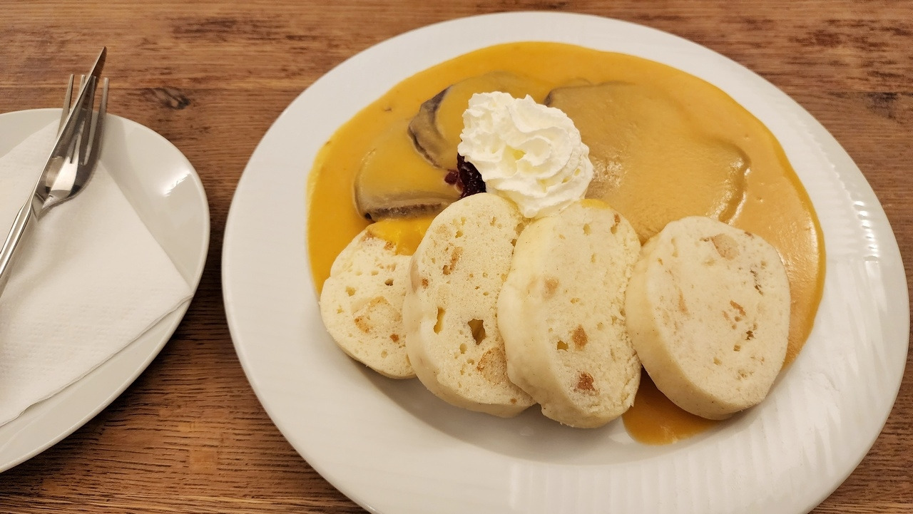 스비치코바의 핵심은 나이프만 닿아도 부서질 정도로 연하게 조리된 등심에 소스, 생크림과 블루베리잼을 얹어 먹는 것이다. 뭔가 낯선 조합이지만 서로 어울린다. 한마디로 촉촉한 스테이크라고나 할까. 함께 먹는 빵은 전형적 서양 빵이 아닌 '크네들리키(Knedliky)'라는 빵이었다. 발효된 반죽을 오븐에 굽지 않고 끓는 물에 데쳐 만드는 체코 전통빵이라고 한다. 발효 반죽을 수증기 올린 찜통에 쪄서 만드는 우리 찐빵과 비슷한 조리법이다. 비주얼은 물론 쫀득하면서도 폭신한 식감 또한 찐빵과 닮았다.