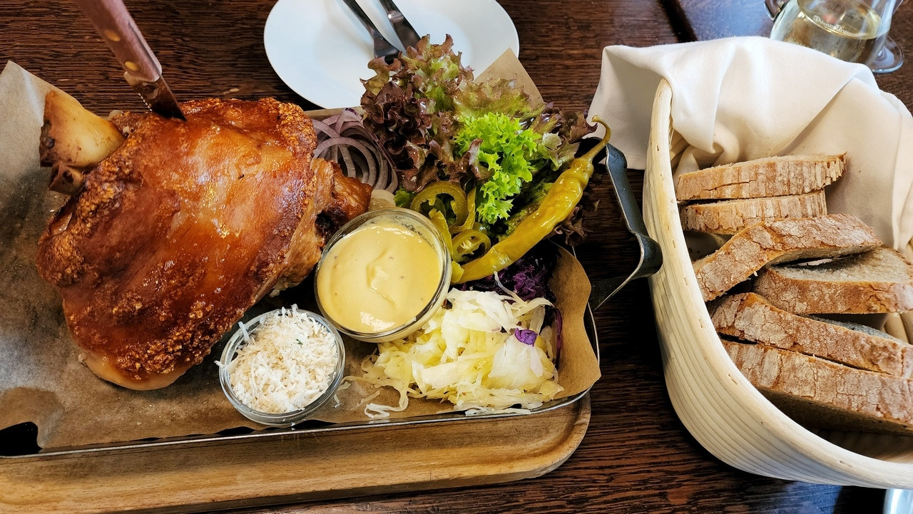 음식을 받고 보니 독일의 슈바인스학세(Schweinshaxe)와 쏙 빼닮았다. 돼지다리의 정강이 부분을 삶아 오븐에 구워내는 요리로 재료나 조리방법, 심지어 가운데를 나이프로 찔러 내오는 담김새도 비슷했다. 새콤한 양배추절임과 각종 피클, 가늘게 채 썬 호스래디시(horseradish)가 같이 나왔다. 처음 먹어본 호스래디시는 서양의 고추냉이라고 한다는데 우리나라 매운 무 맛이었다.