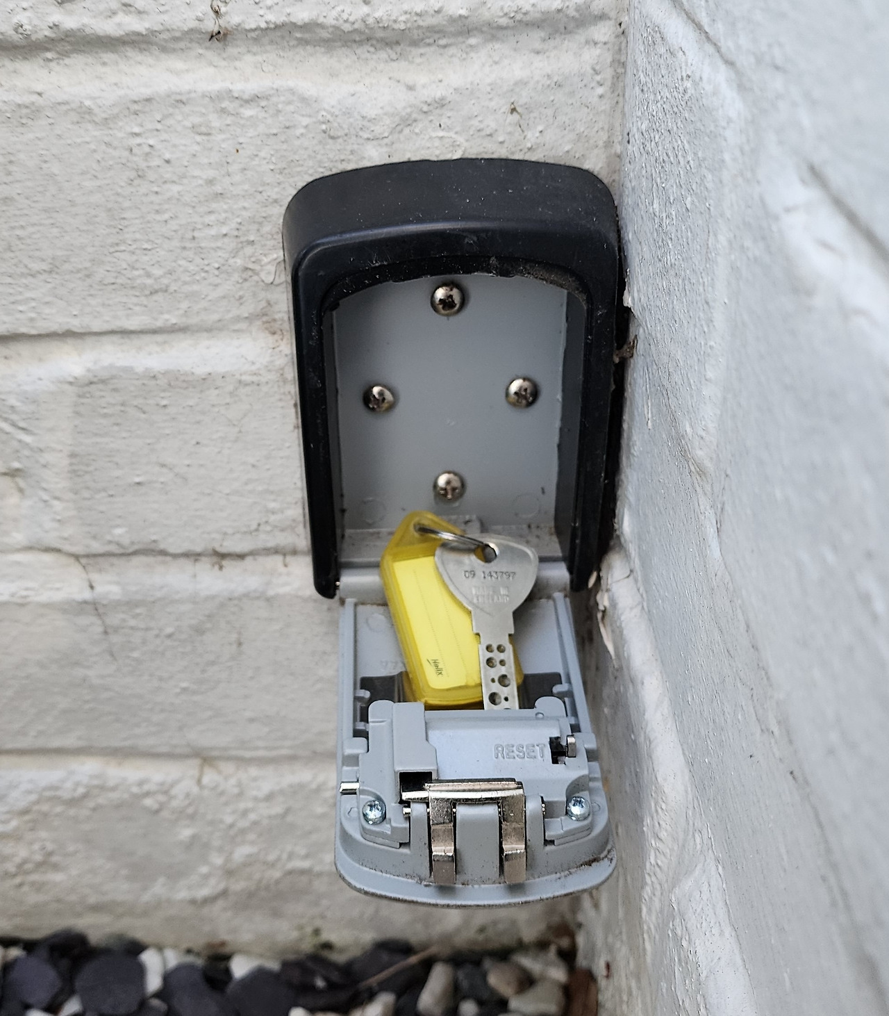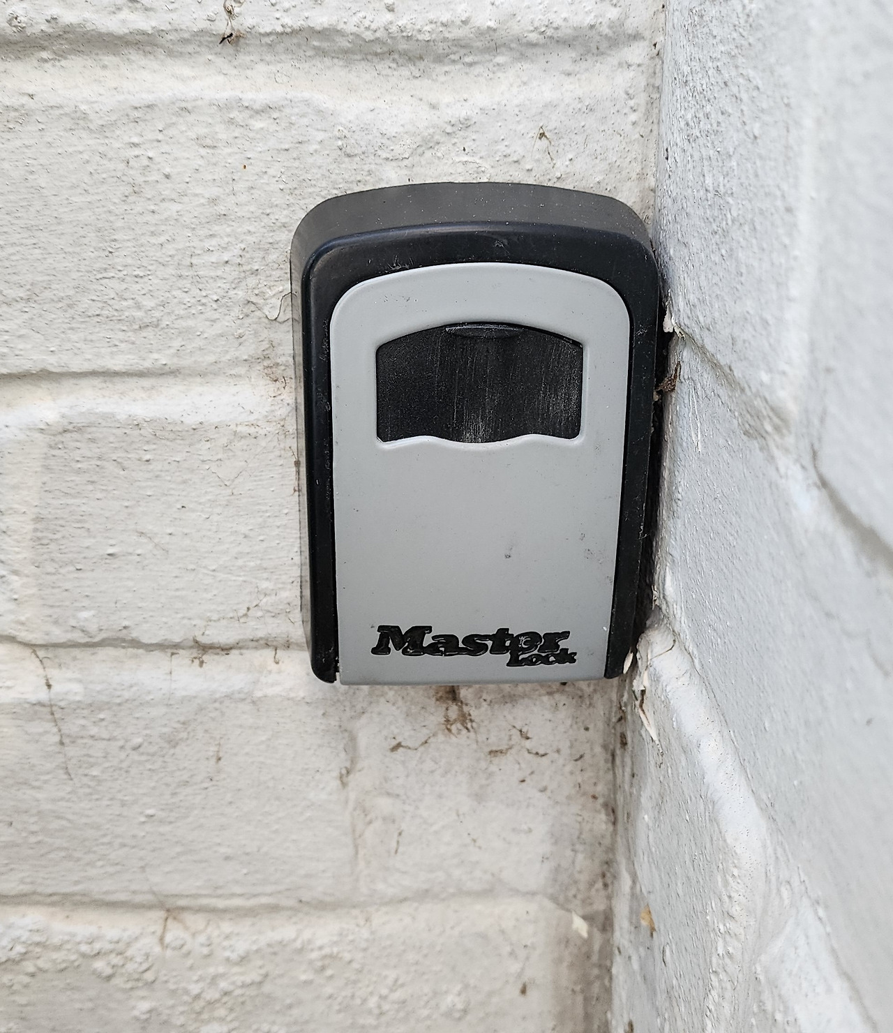 담장 안에 붙은 열쇠함. 번호 자물쇠를 돌리면 함이 열리고 열쇠가 나오는 구조다.