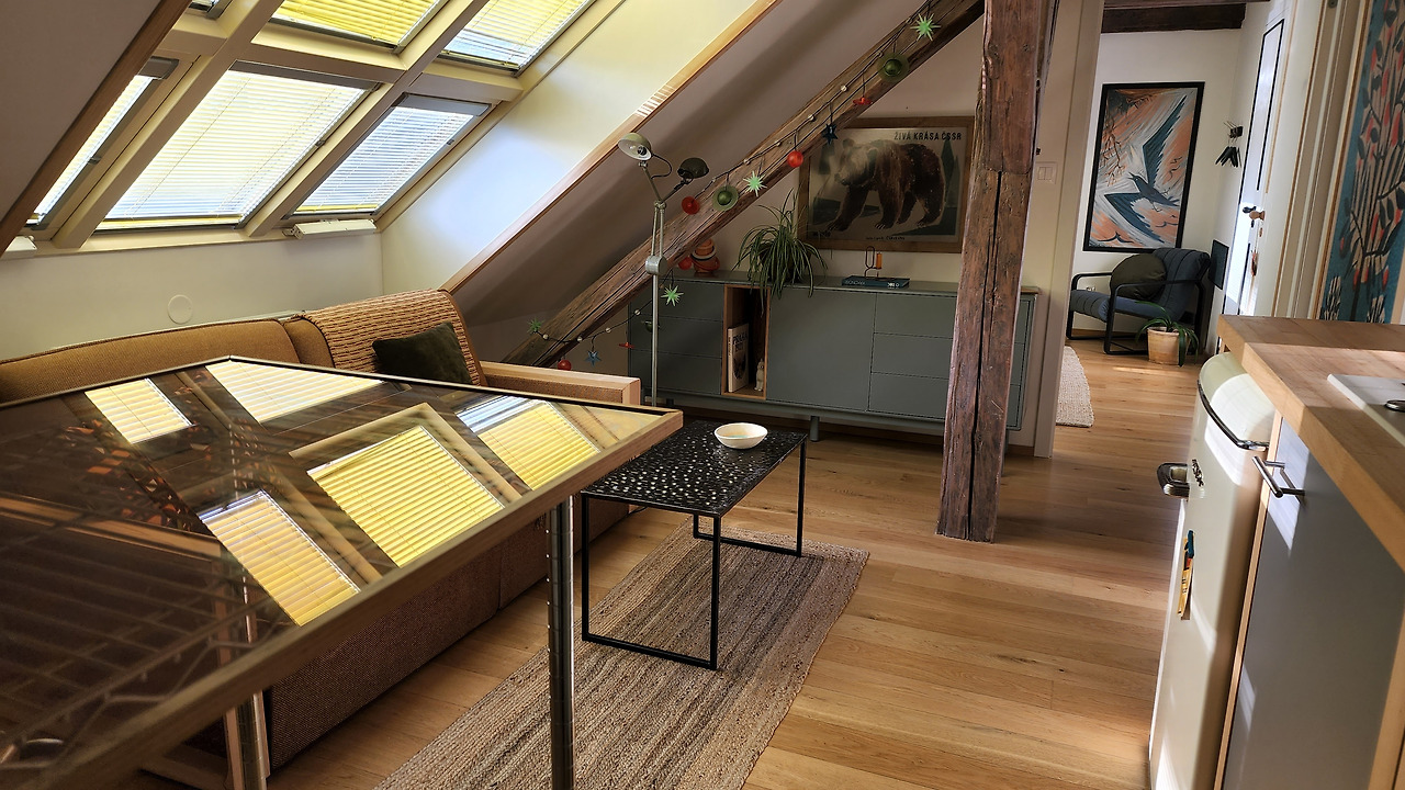 방과 주방 겸 거실, 욕실, 샤워실로 이루어진 프라하 숙소, 천창이 멋졌음.