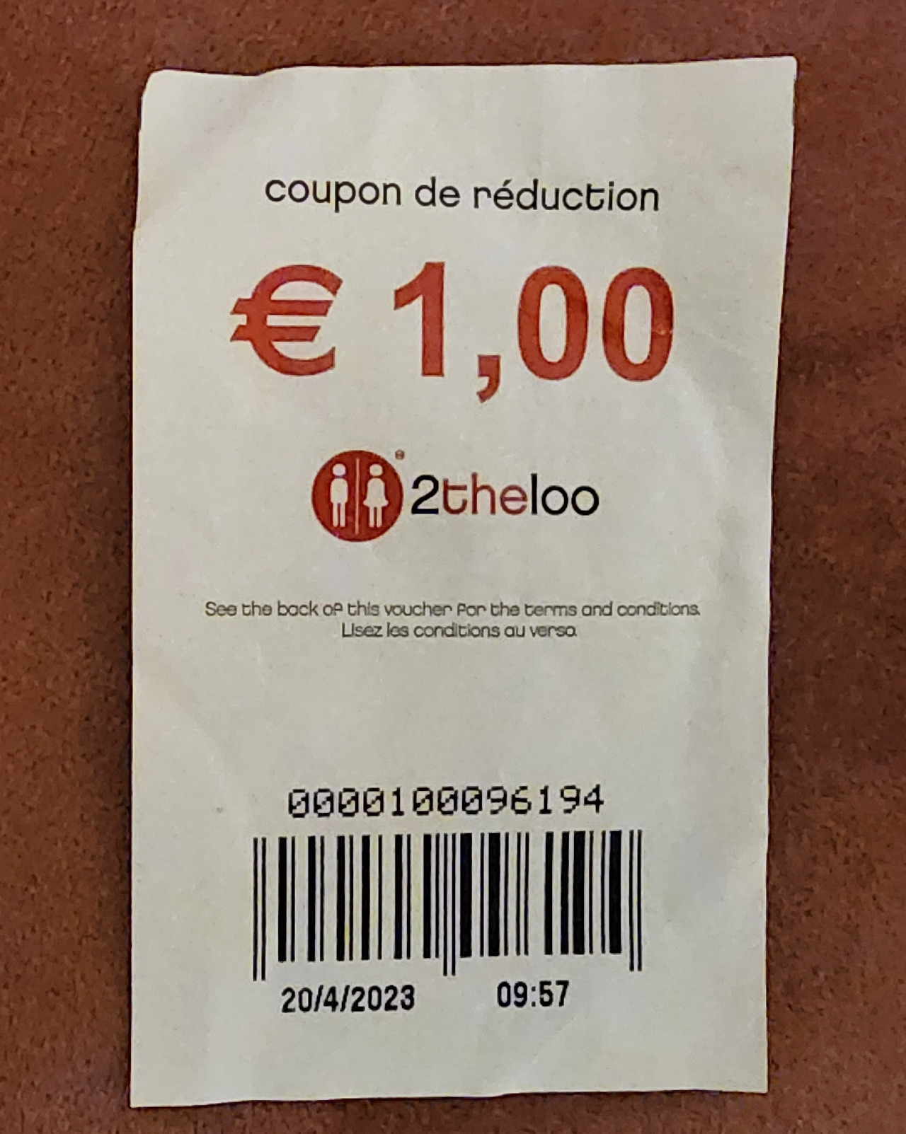 다정한 화장실 표시를 따라 가면 만나는 화장실비 징수기(왼) & 화장실 요금 1유로 영수증(오)