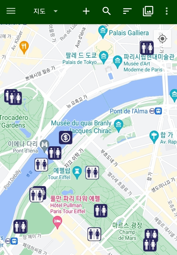 무료화장실을 찾아주는 앱(Where is Public Toilet)을 파리 에펠탑 근처에서 구동시켰을 때