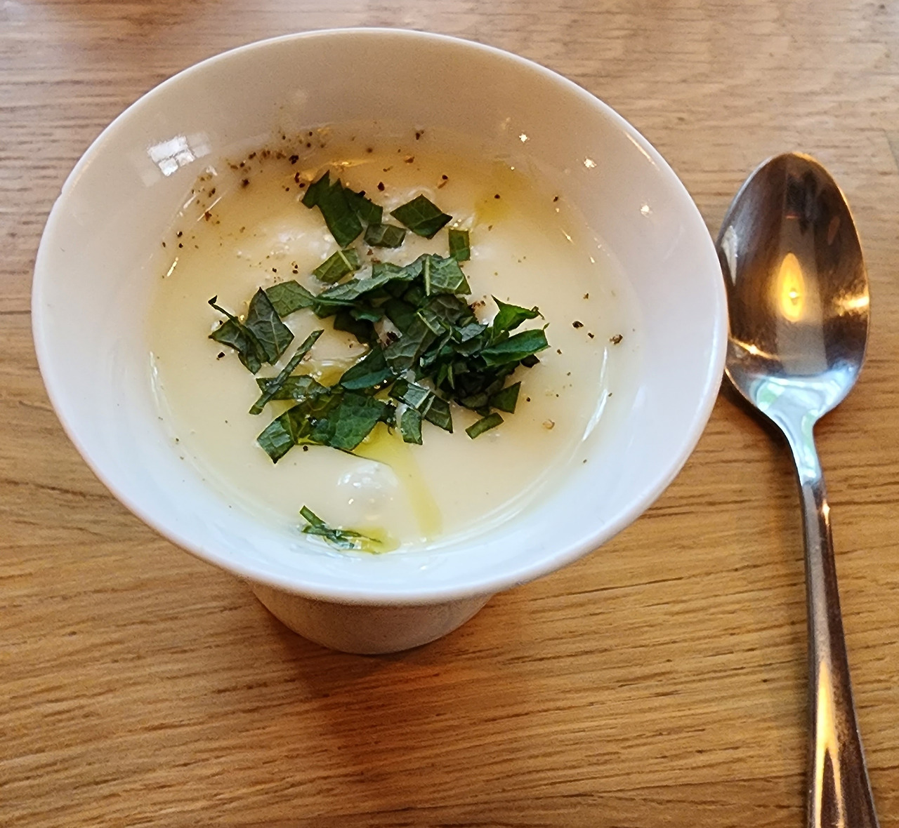 셋이서 스타터와 메인 메뉴를 하나씩 고르고 기다리니 시키지도않은 음식이 나왔다. 이것이 주방장이 알아서 내어 준다는 한입거리 애피타이저, '아뮤즈부쉬(Amuse-bouche)'인가? 또 수프 비슷한 것이 나왔다. 그렇다면 이건 정식 애피타이저 '앙트레'? 시골 식당이라 파리보다 인심이 좋은지 식전에 뭘 자꾸 준다. 고맙게도.