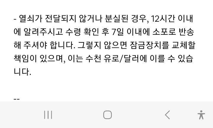 유럽 열쇠 괴담을 누설하면 이렇다. 만약의 경우 내가 숙소 열쇠 세트 2개를 잃어버렸다고 하자. 일단 그 집의 잠금장치 교체 비용과 열쇠값을 물어내야 한다. 또 공동 현관의 열쇠 시스템도 통째로 갈아야 하고 같은 현관을 쓰는 모든 세대의 열쇠를 다 새로 맞춰줘야 한다. 열쇠 2개를 잃어버리면 장비값에 유럽의 비싼 인건비까지 더해 우리 돈으로 수백만 원을 물어야 한다. 그래서 생긴 게 열쇠 보험(Key Insurance)이고 실제로 현지인들은 열쇠 보험에 가입한다고 한다.