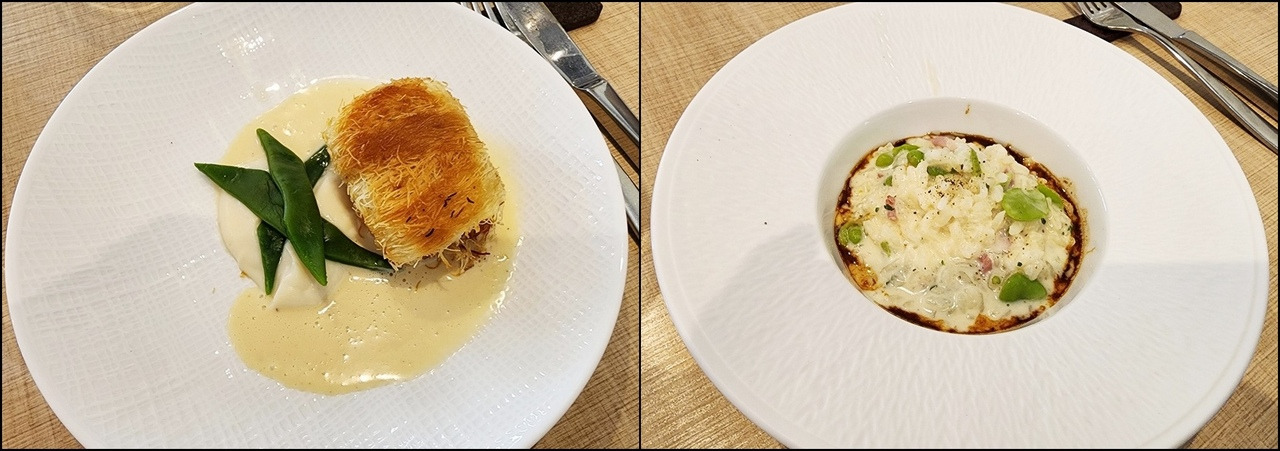 친구가 앙트레로 주문했던 오늘의 생선 요리(대구 튀김)(왼)와 메인 메뉴 리소토(오)