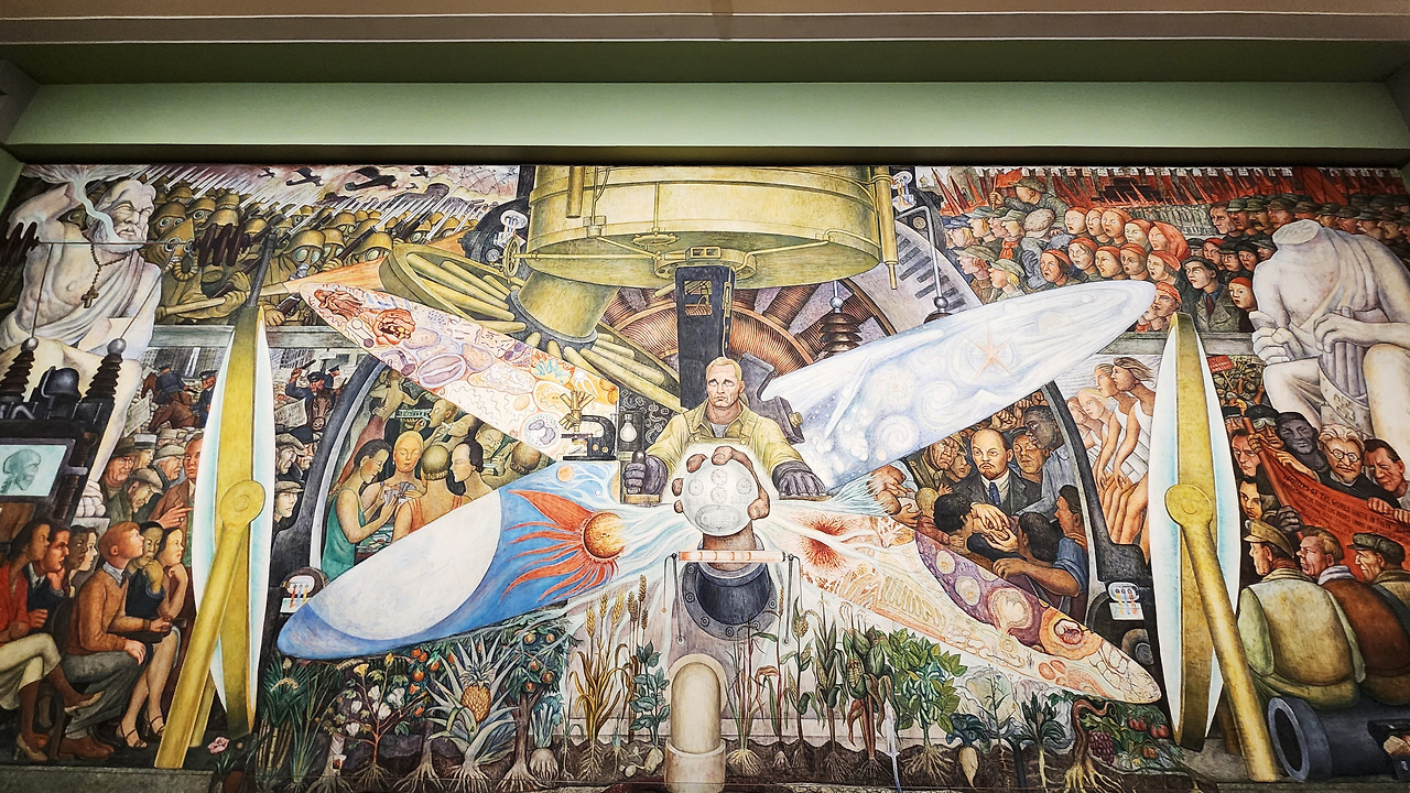 교차로의 남자(디에로 리베라 작). 미국 록펠러재단 벽화로 제작되었다가 노동자 찬양 내용과 레닌을 그려넣은 것이 문제가 되어 파괴된 후 멕시코에서 다시 그린 작품